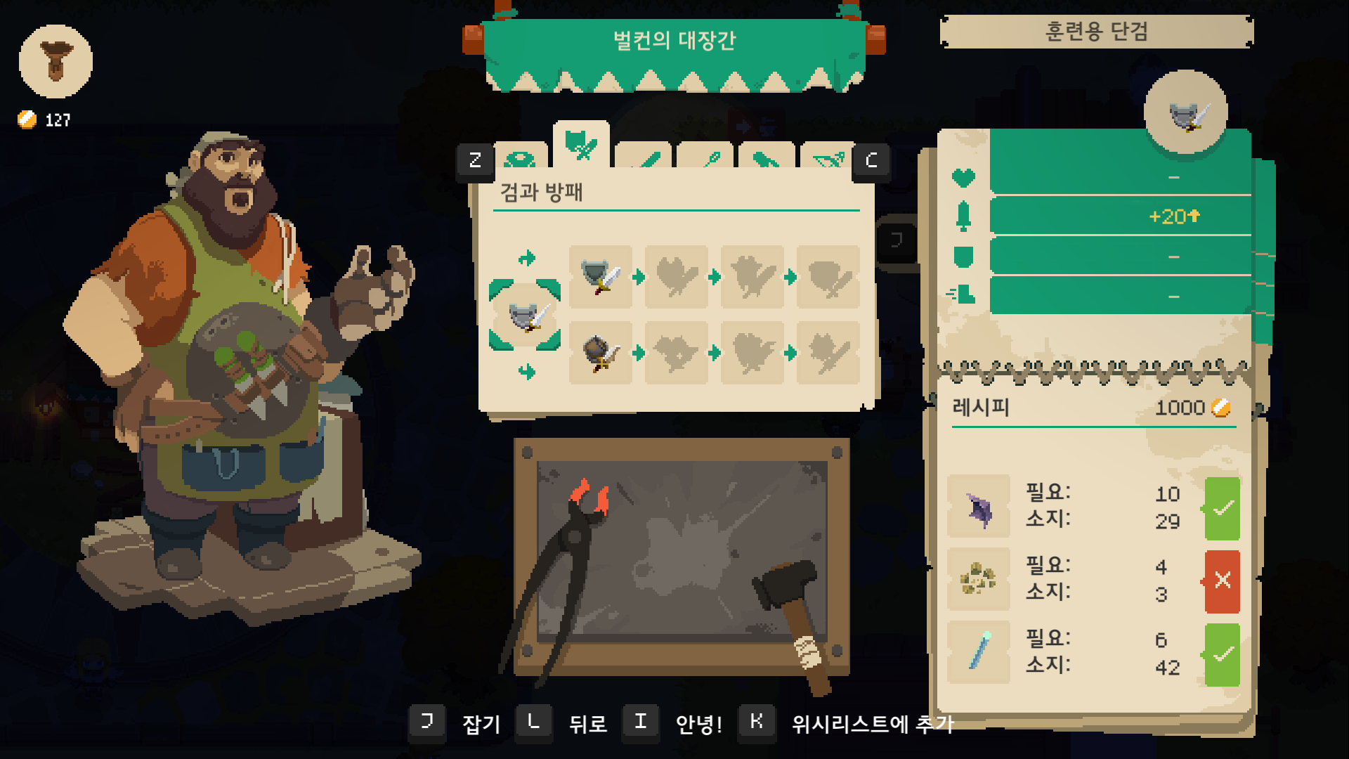- 던전에서 파밍후 갖고있는 재료들로 다양한 방어구와 무기를 제작할 수 있다.